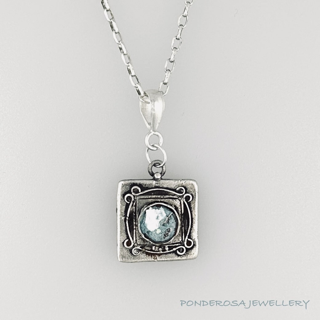This pendant is a piece of 2000 year old gorgeous Ancient Roman Glass with exceptional patina. This pendant is set in sterling silver and designed with a sterling silver chain. One-of-a-kind and elegant, this is a special piece of jewellery to add to any collection.
