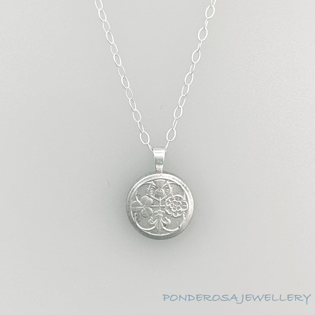 This 5/8 ” round pendant is the punch hole of a silver dollar used to make a coin ring.  The sterling silver chain is 18 ” long and the silver content of the pendant is at least 80 %. Enjoy wearing this very unusual and one of a kind piece of History.