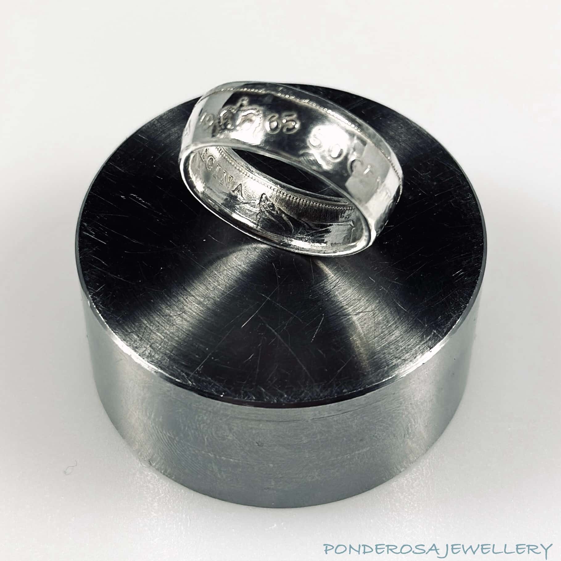 This 1965 Silver Coin has been turned into a size 8 1/4  ring. This coin ring has a silver content of 80 %. Enjoy wearing this very unusual piece of History.