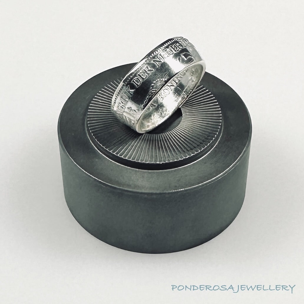 This coin from Netherlands has been turned into a size 8 ring and has a silver content of 72 %. Enjoy wearing this very unusual piece of History.