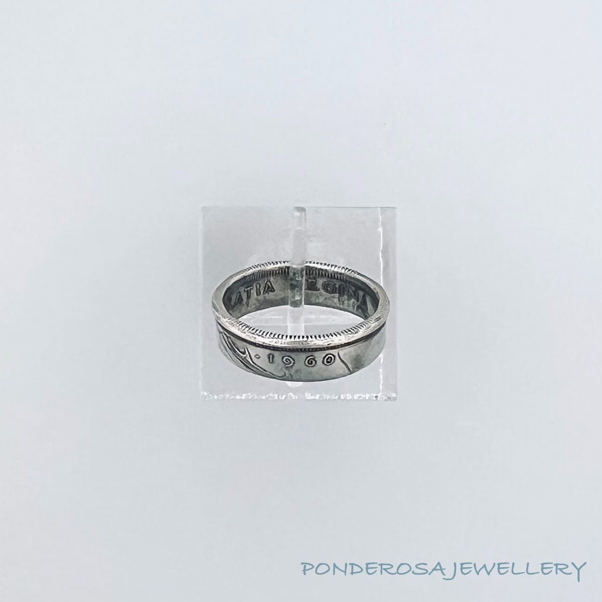 This 1960 Silver Coin can be turned into a ring ranging in size from 4 – 8. This coin ring has a silver content of 80 %. Enjoy wearing this very unusual piece of History.