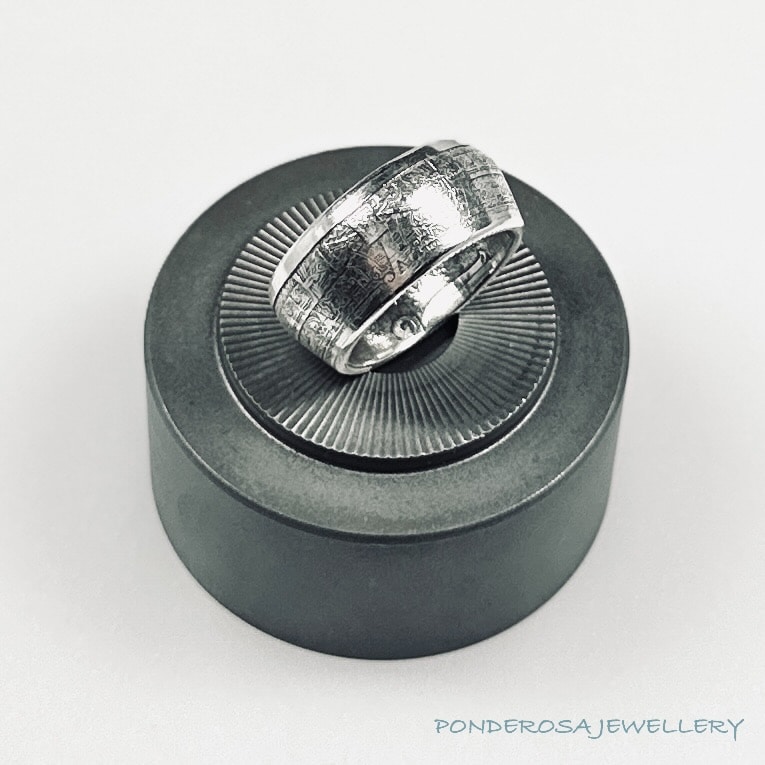 This ring is made from a 1/2 oz pure silver round (.999) that has the design of a Mexican Aztec Calendar.