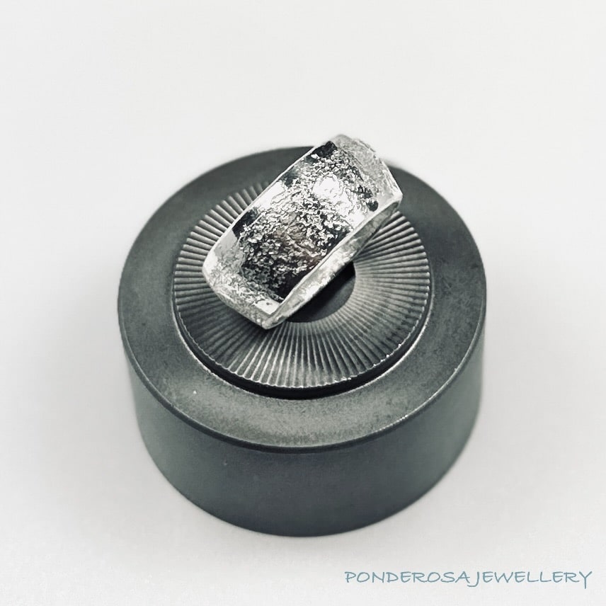 This ring is made from a 1/2 oz pure silver round (.999) that I have hand textured.