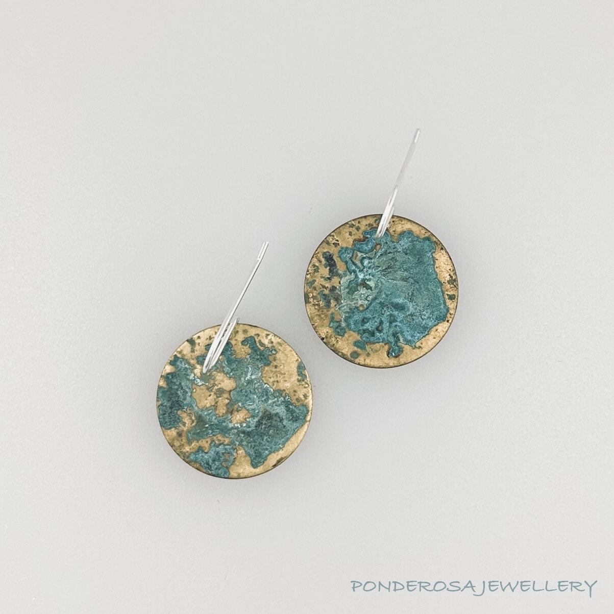 These very cool oxidized brass earrings have been designed with sterling silver ear wires. Earring Wire: sterling silver Material: oxidized brass Drop size:  7/8 ” round (excluding ear wire)