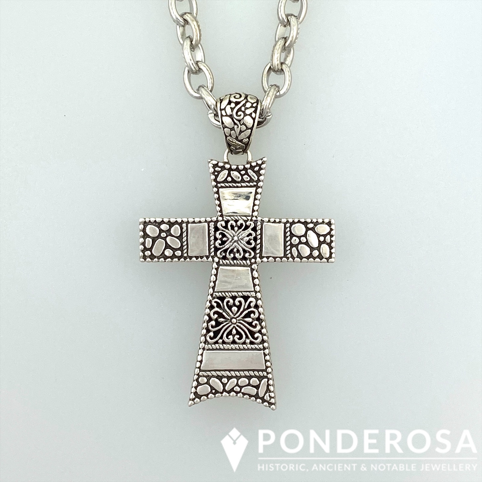 This decorative sterling silver cross has been designed with a silver plated chain.
