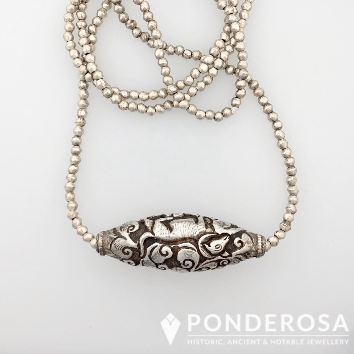 This wonderful large horizontal bead from Tibet has amazing detail and is designed with small coin silver beads.