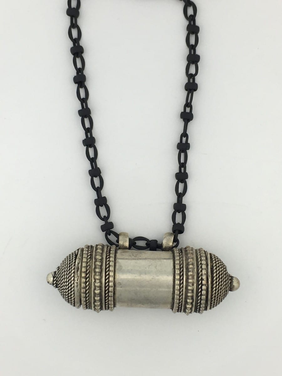 This wonderful pendant is from Tibet and opens at the side. The black chain is a great accent for the pendant.