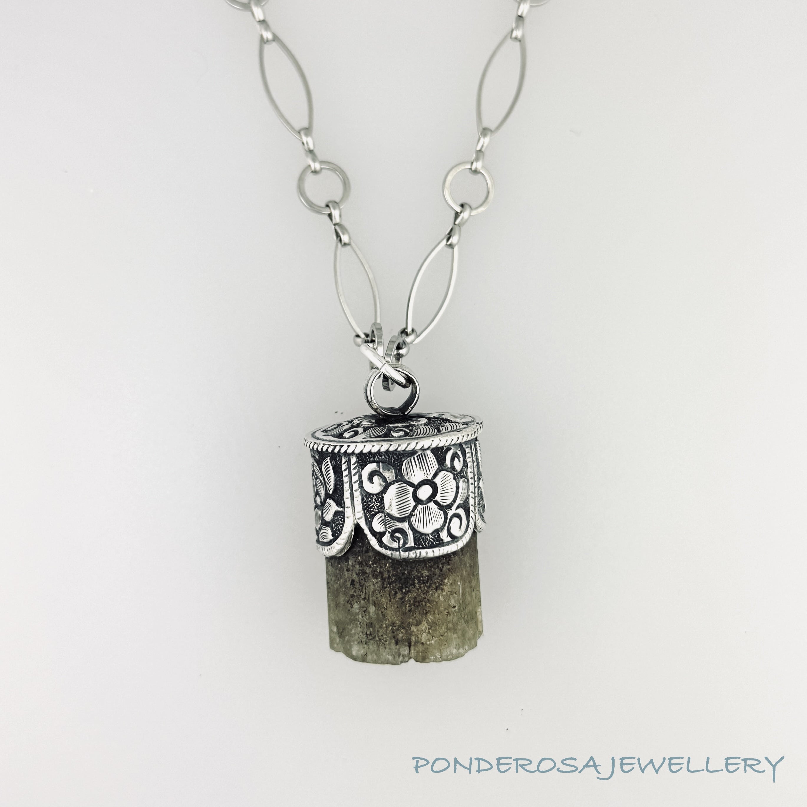 This wonderful tourmaline stone, from Tibet has been set in sterling silver and designed with a silver plated that is a great accent for the pendant. Chain length: 32” Chain material: silver plate Setting material: sterling silver  Pendant size: 1 1/4 ” tall x 1 ” wide (round)