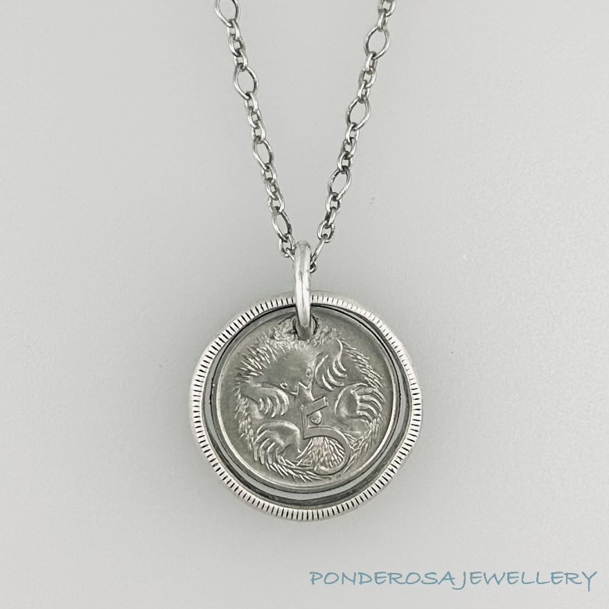 This whimsical necklace has been designed with a Canadian Silver Quarter (1943) and a Five Cent Australian Coin (1993). The five cent coin floats inside of the silver coin ring.