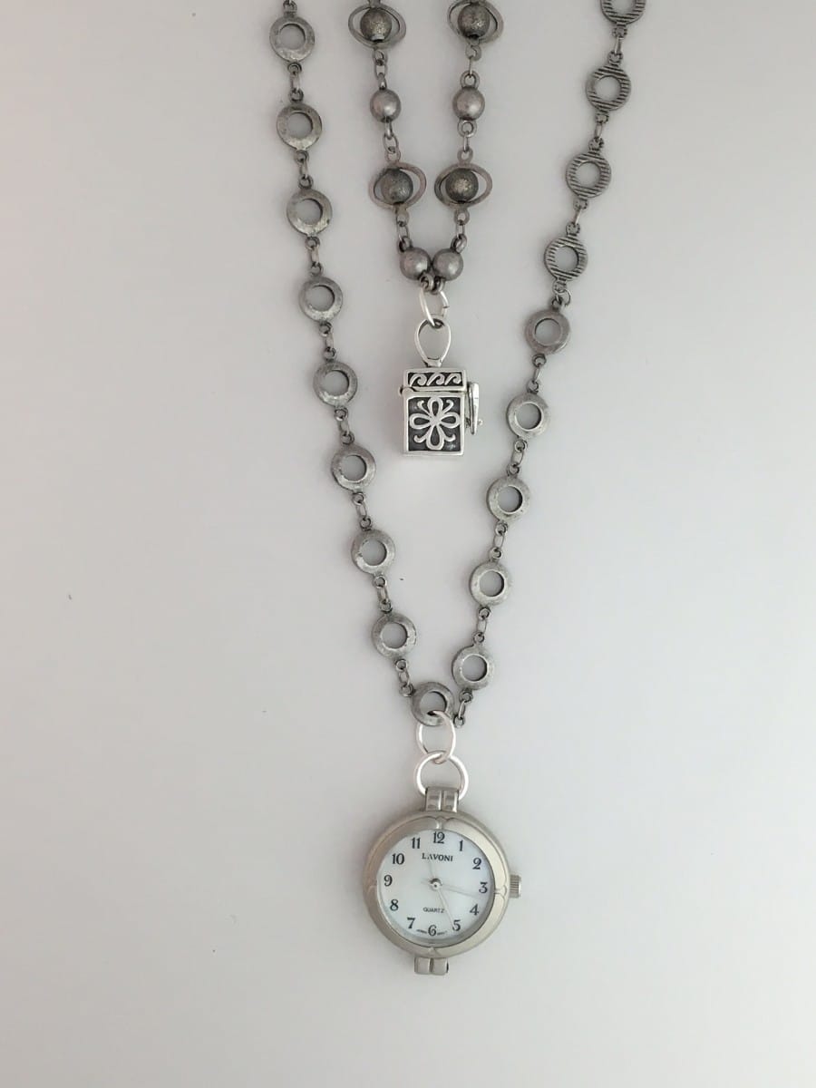 This 1920’s vintage watch has been dismantled and repurposed to create this lovely piece designed with a sterling silver wish box and finished with antique silver plated chain. This once lovely time piece has been given new life and can now be enjoyed by a new owner!