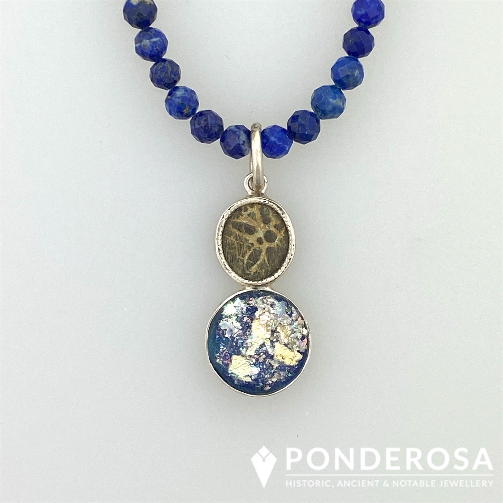This pendant is designed with a piece of 2000 year old cobalt blue Ancient Roman Glass and a 2000 year old Widow’s Mite coin. They have been set in sterling silver and designed with faceted lapis stone beads.